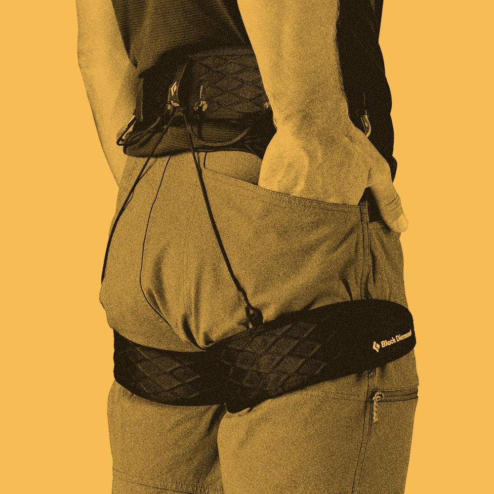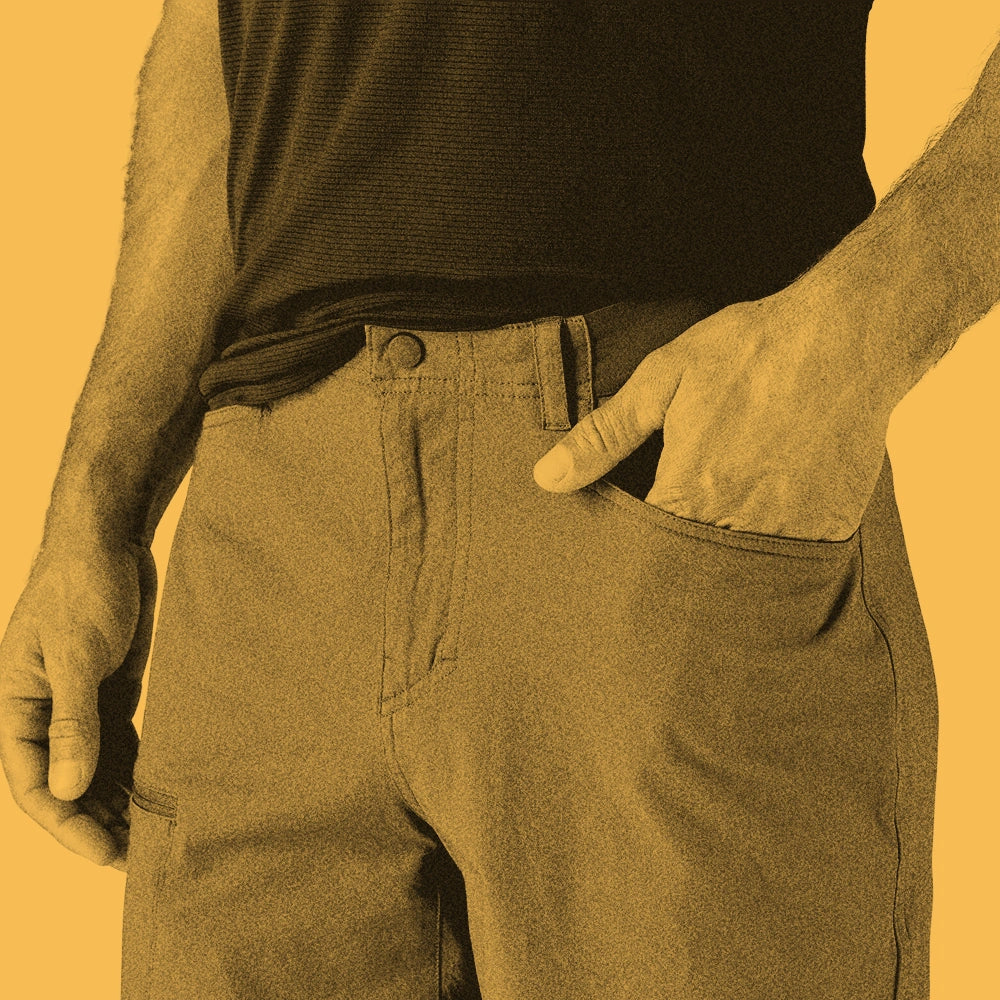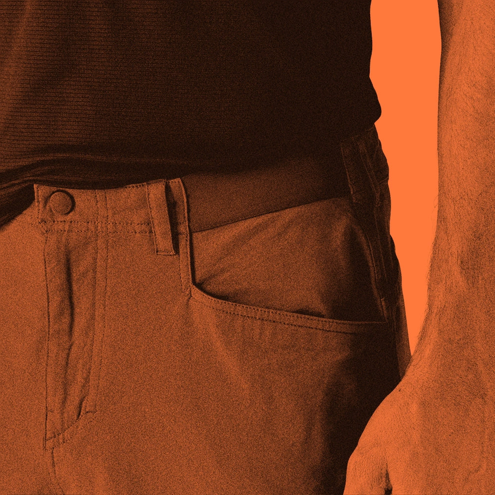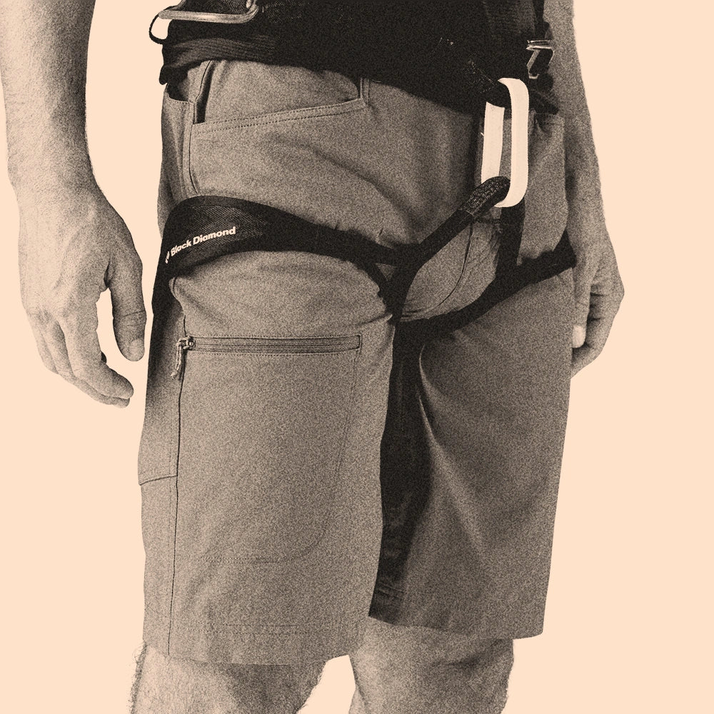Zip fly with belt loops and a partially elasticised waistband create a low-bulk, comfortable fit - especially under a harness. Drop-in front pockets have breathable mesh pocket bags and lie-flat construction - again, perfect for comfort under a harness. The two top-entry back pockets create a reinforced seat for added durability; a zippered right-thigh security pocket sits below harness leg loops.