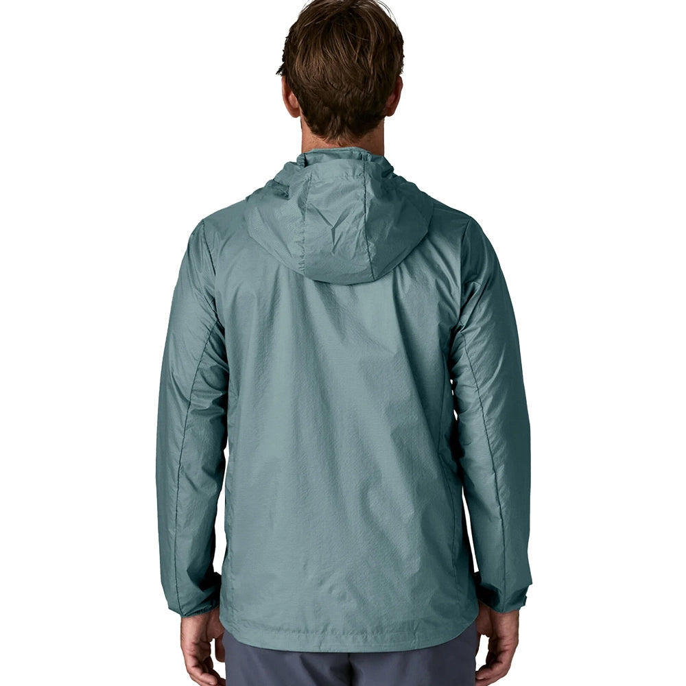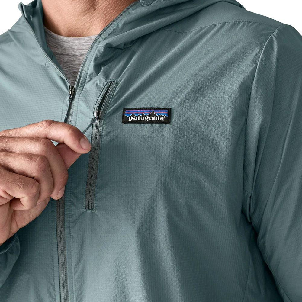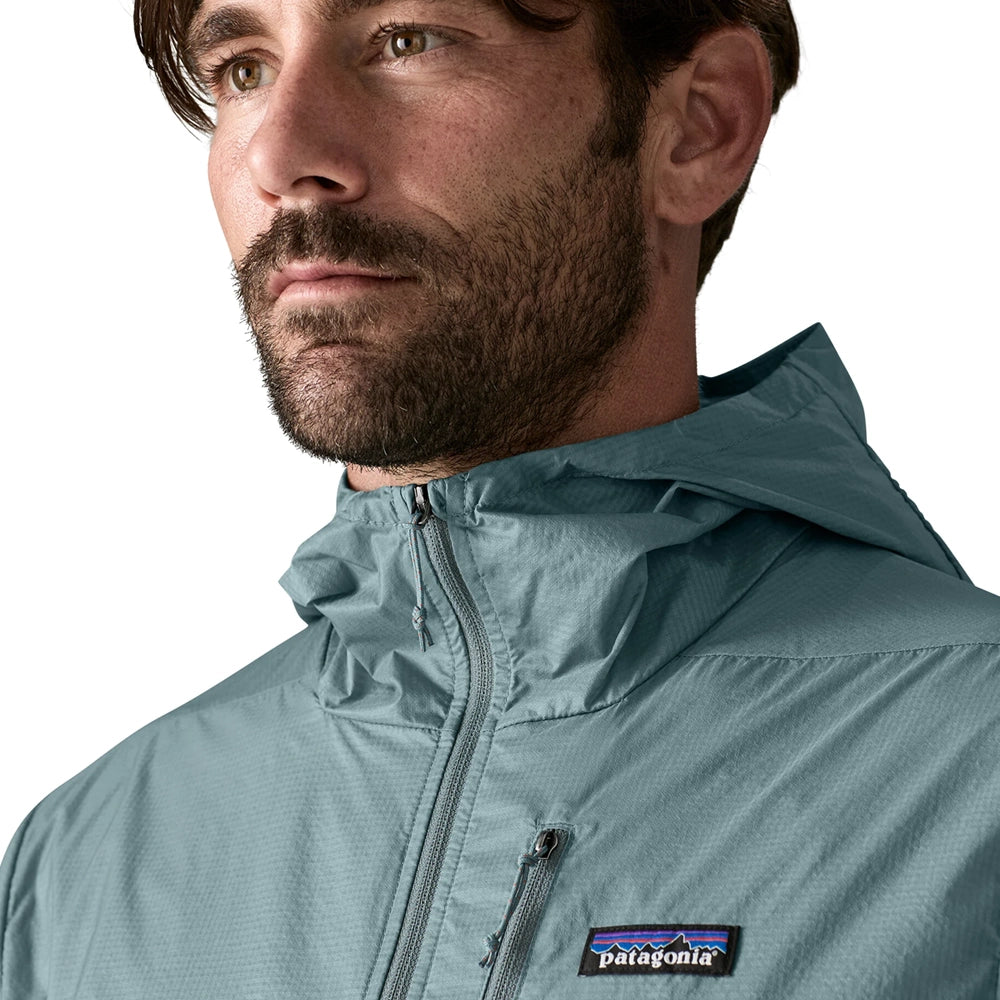 Half-elastic cuffs seal the wrists of the Houdini Jacket and a drawcord cinches the hem. A DWR (durable water repellent) made without intentionally added PFAS to resist light moisture coats the shell and the centre-front zipper. The Patagonia logo on the left chest is reflective to assist with visibility on the trail.