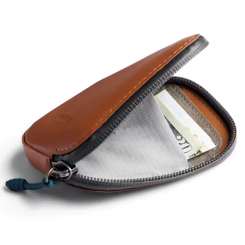With a pre-molded water-resistant leather shell and a water-resistant Aquaguard zipper, this pouch will keep most of the elements out. Featuring flexible storage for 10 cards, folded notes, coins, keys and more. It has two internal stretch pockets and a raised coin and/or key pocket with key loop.