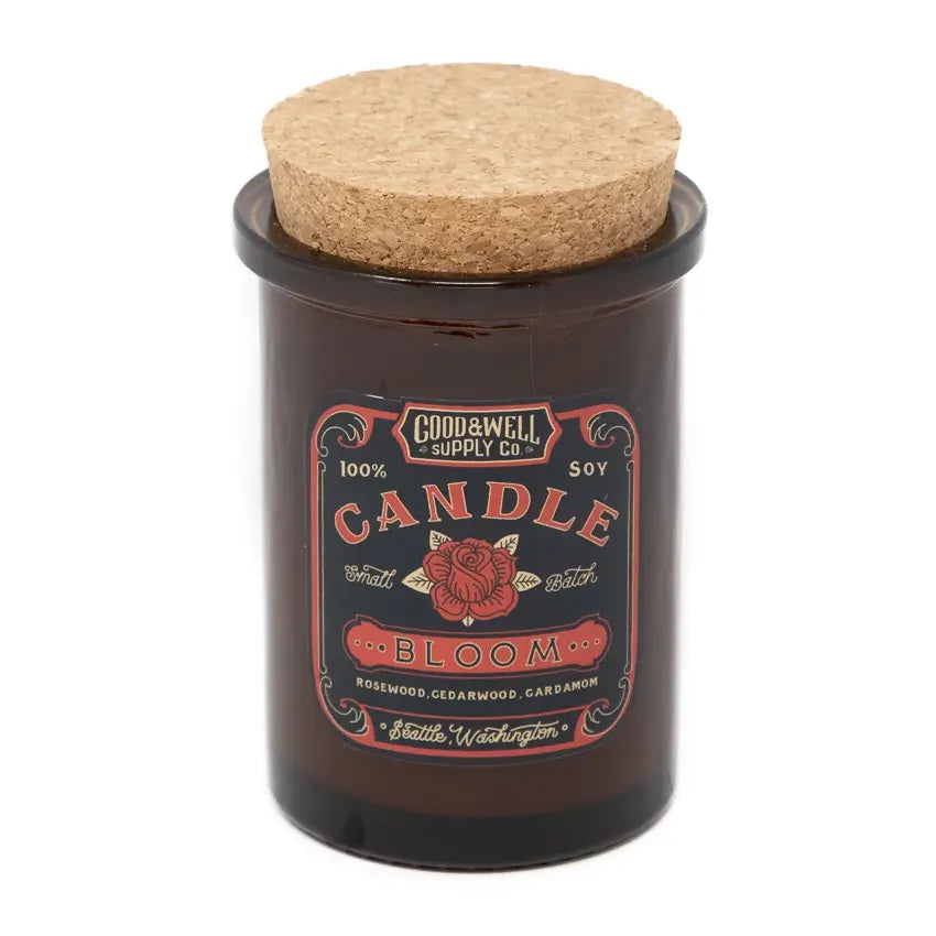 These beautiful candles from Good & Well are hand poured into a glass amber apothecary jar with cork lid. Made with all natural soy wax, USA-grown balsa wood wicks, and the highest quality essential oil and botanical fragrance blends.