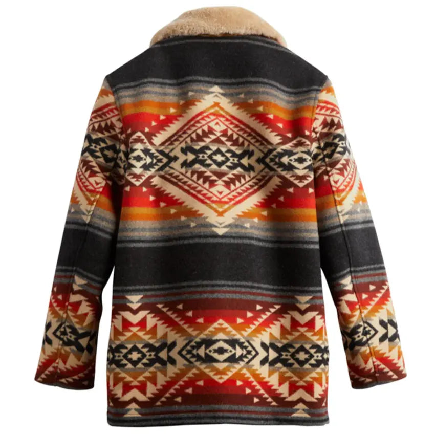 Woven from a warm wool blend, this outdoor coat features a genuine shearling collar for unrivalled warmth and comfort. Two pockets on the front, and lined for even more warmth. Patch on the inside tells the story of the beautiful jacquard pattern.
