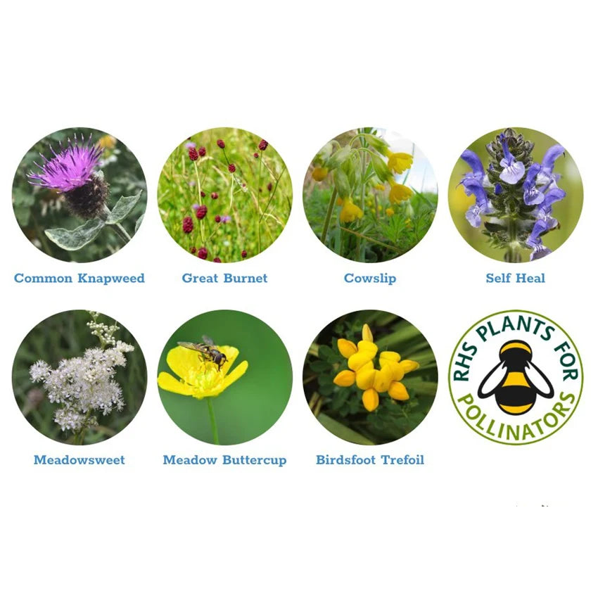 Includes: Common Knapweed (Centaurea nigra), Great Burnet (Sanguisorba officinalis), Cowslip (Primula veris), Self Heal (Prunella vulgaris), Meadowsweet (Filipendula ulmaria), Birdsfoot Trefoil (Lotus corniculatus), Meadow Buttercup (Ranunculus acris)