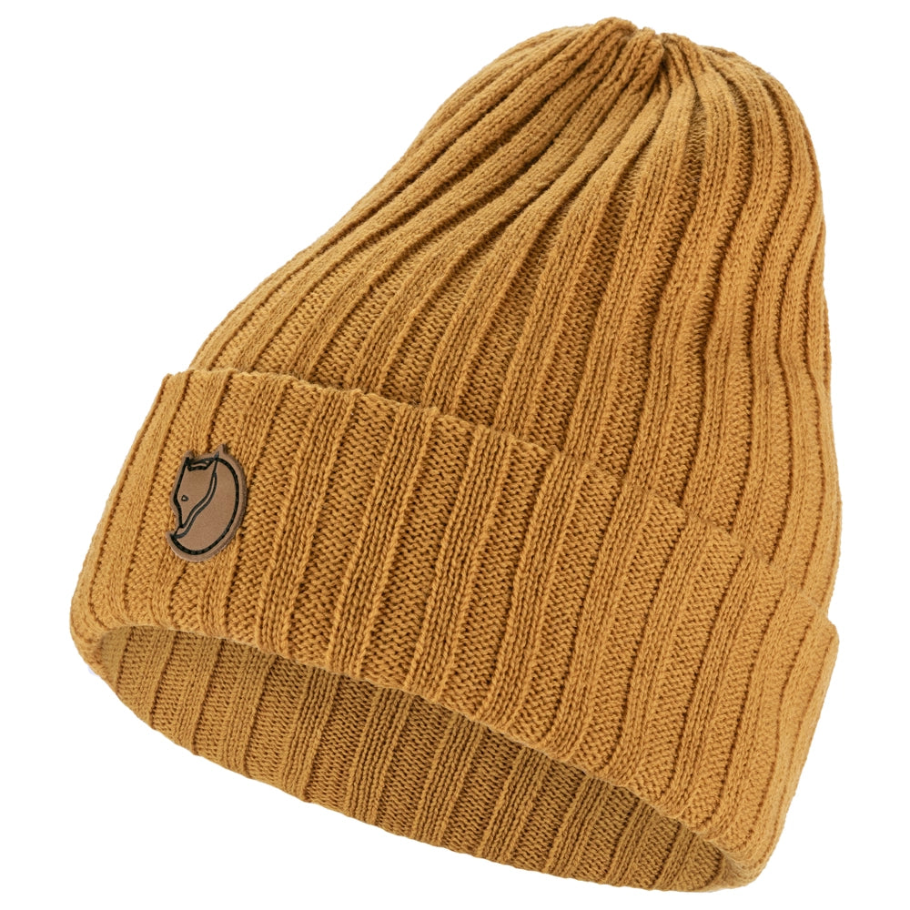 Double-knitted hat from Fjällräven in 100% traceable wool that makes it both warm and durable. Double-fold at the bottom and ribbed for extra warmth and a comfortable fit, the fold allows you to roll or fold to dial in the fit. Fjällräven arctic fox leather logo detail on the forehead.