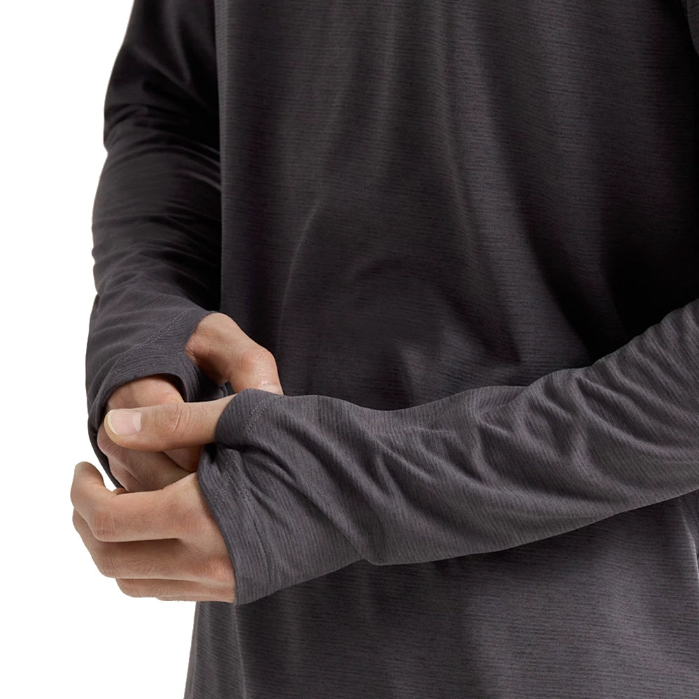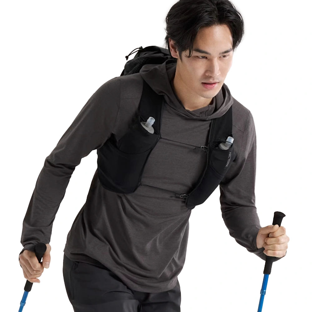 Made form one of their lightest fabrics, the 100% recycled Phasic™ LT fabric wicks moisture, breathes, provides UPF 40+ sun protection, and is treated for odour resistance. A brimmed helmet-compatible hood protects the face, thumb loops hold sleeves in place, and low-profile seams ride comfortably under a pack.