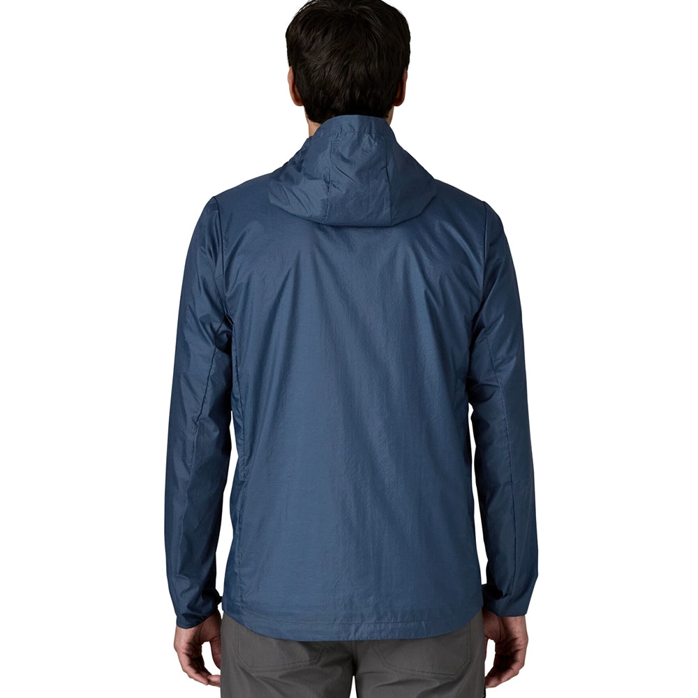 Half-elastic cuffs seal the wrists of the Houdini Jacket and a drawcord cinches the hem. A DWR (durable water repellent) made without intentionally added PFAS to resist light moisture coats the shell and the centre-front zipper. The Patagonia logo on the left chest is reflective to assist with visibility on the trail.