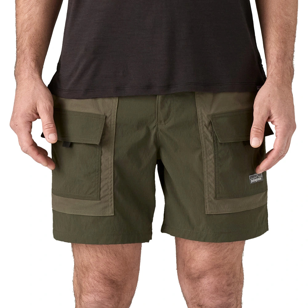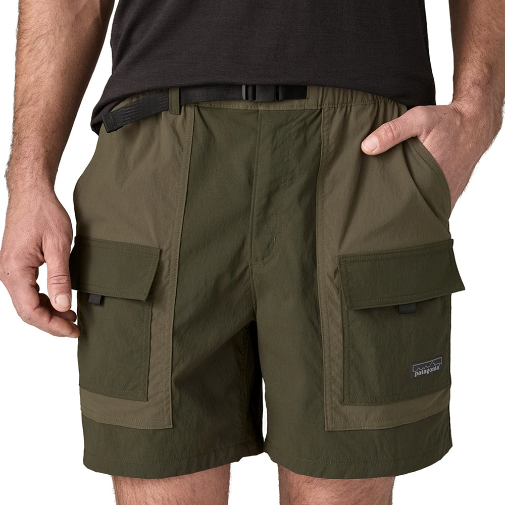 Featuring a mid-rise, these are relaxed-fit shorts with a 6" inseam. The elastic waistband has a zip fly and a button closure, with an adjustable webbing belt that can be tucked into the belt loop to keep excess webbing at bay. Two slash, drop-in front pockets and two front-thigh pockets have flaps and hook-and-loop closures, with webbing tabs for ease of use.