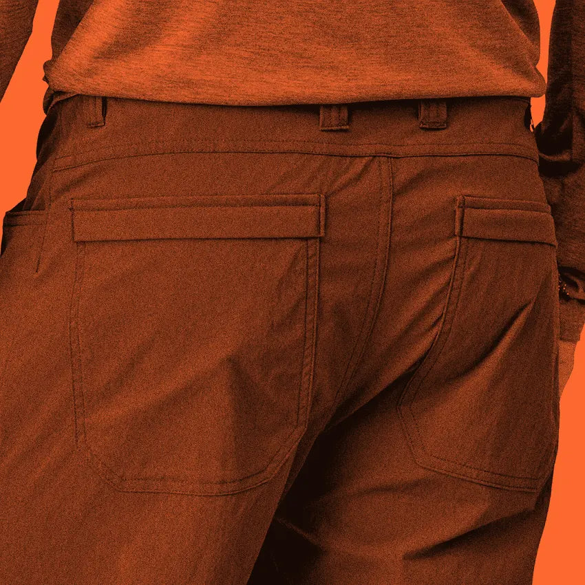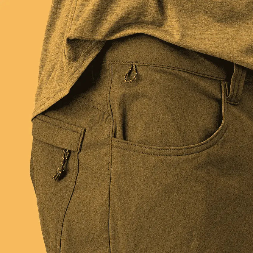 The waistband of the Quandary Shorts have belt loops, a zipper fly with a metal-button closure and a hidden drawcord. Two front drop-in pockets and two back patch pockets, and there's a reinforced hemostat/carabiner loop on the front-right pocket. The inseam features a gusset for increased mobility.