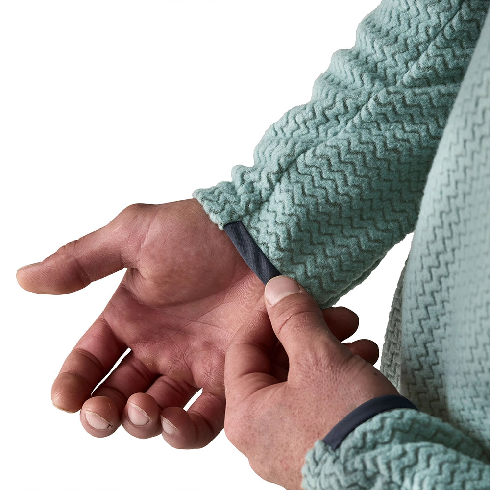 The 100% recycled polyester jacquard fleece with hollow-core yarns wicks moisture, dries fast and is highly breathable for cool-weather activities. Its zigzag-knit pattern increases airflow and minimises bulk for breathable, compressible performance.