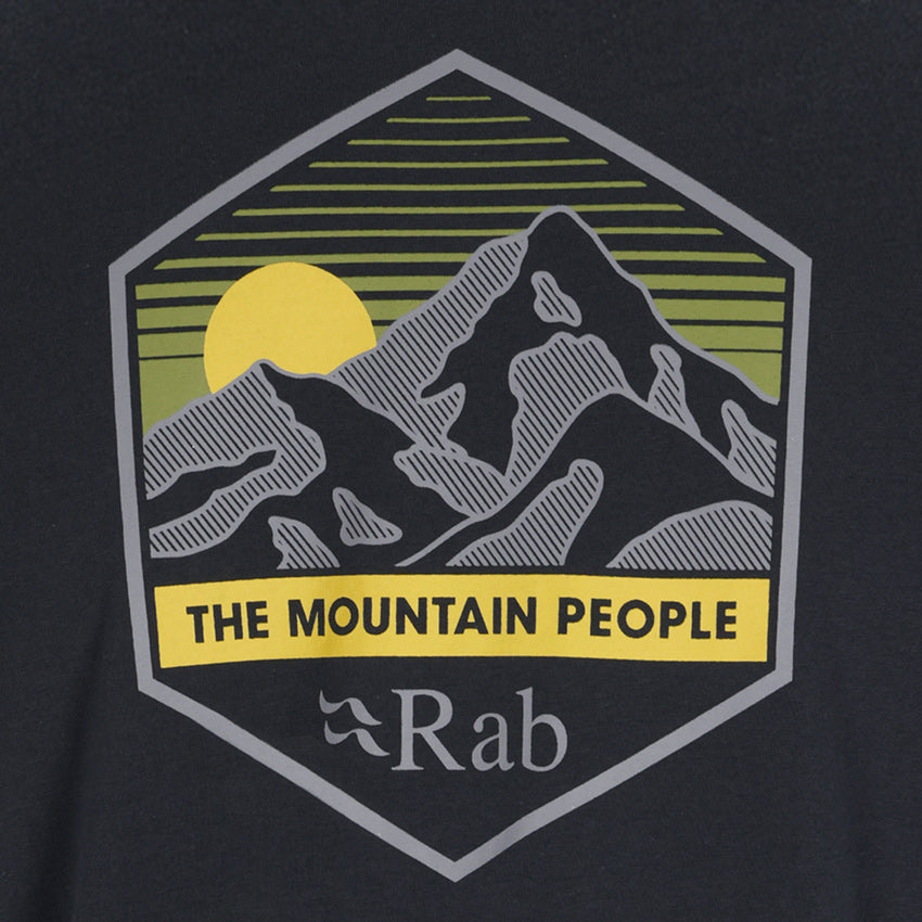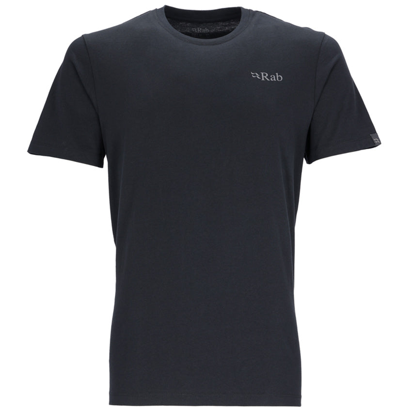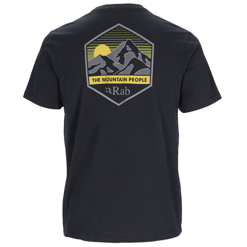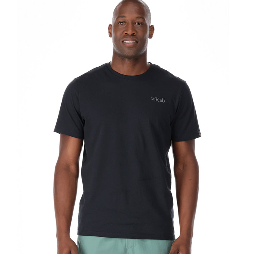 A soft, 100% organic cotton t-shirt from Rab, an everyday tee with a small Rab logo on the front and their Mountain Peak Graphic on the back. It's designed to keep you comfortable during a wide range of activities, perfect for tackling any trail, road, or mountain.