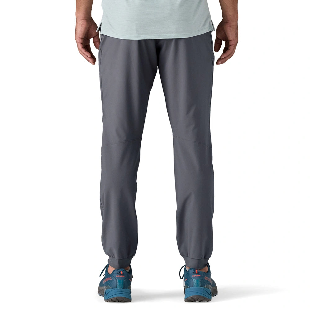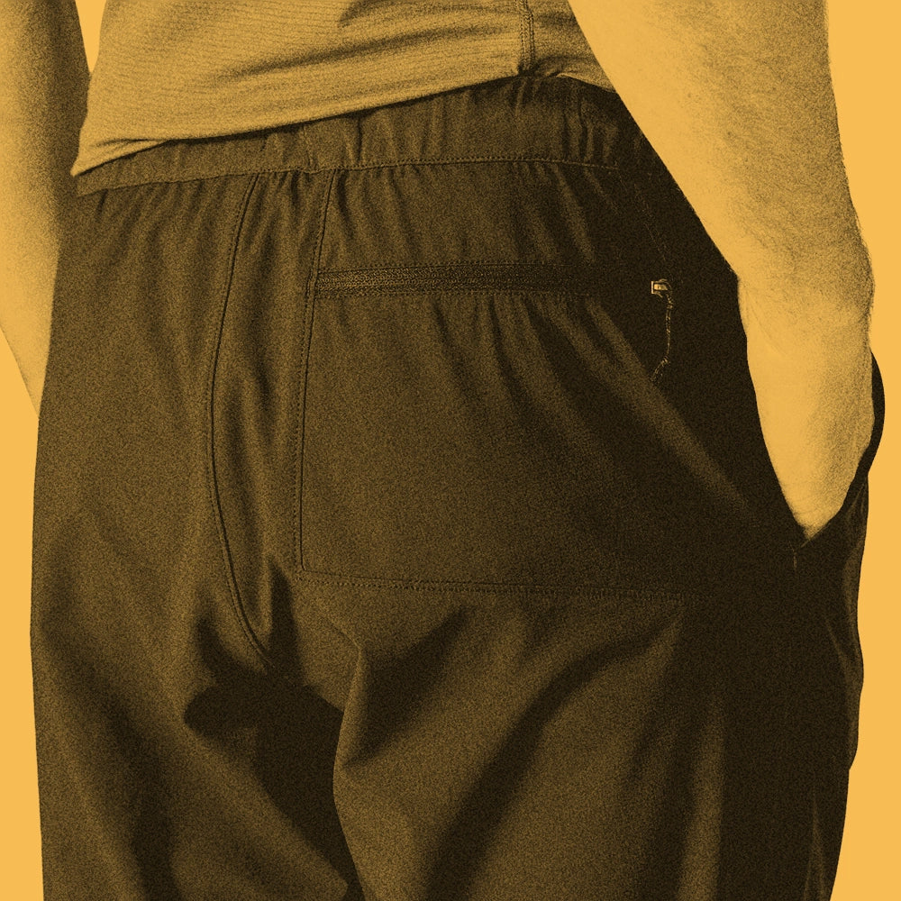 A slimmer fit jogger with stretch-knit waistband and cuffs, featuring a drawcord for adjustability. Two drop-in front pockets and back-right zippered pocket and articulated shaping at the knees for a full range of movement. The lightweight fabric allows compressibility, easy packing when on the move, and offer a bit of protection from the elements, thanks to a durable water repellent (DWR) finish made without intentionally added PFAS.