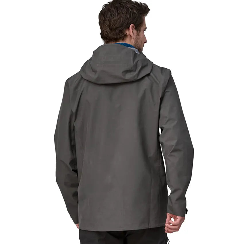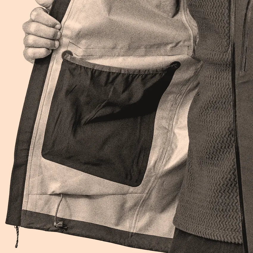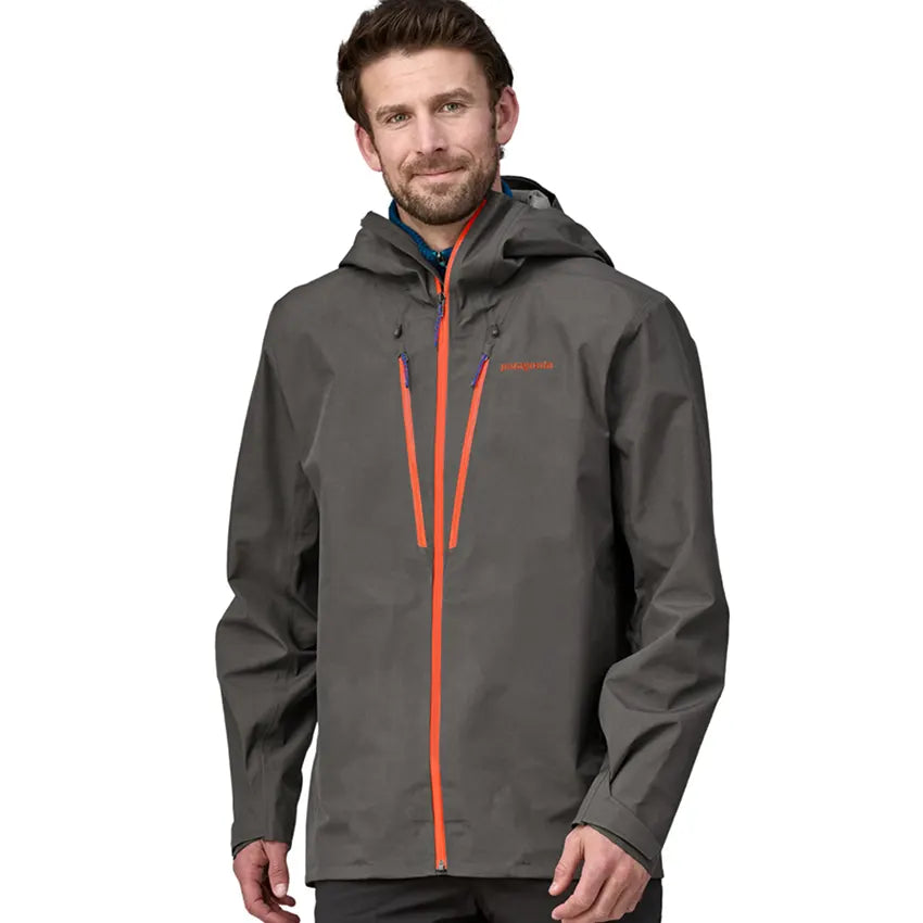 Featuring a helmet compatible hood with laminated visor and reinforced brim that effectively sheds water, two-way adjustment provides good visibility in poor conditions with or without a helmet. There are two Napoleon chest pockets with watertight zips and zipper garages, two welted front pockets stay clear of a harness or a pack waistbelt and an interior drop-in pocket.