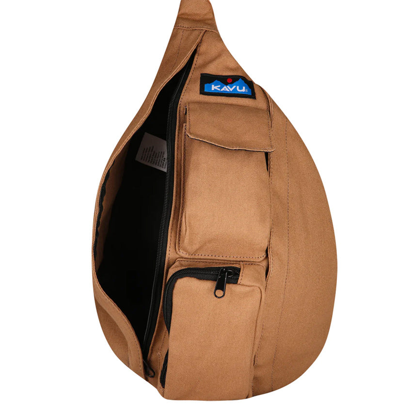 This sling bag features an adjustable rope shoulder strap with side release buckle to get the perfect fit. Two vertical zip compartments, two key or cell phone pockets and a padded back with KAVU embroidery to keep everything protected.