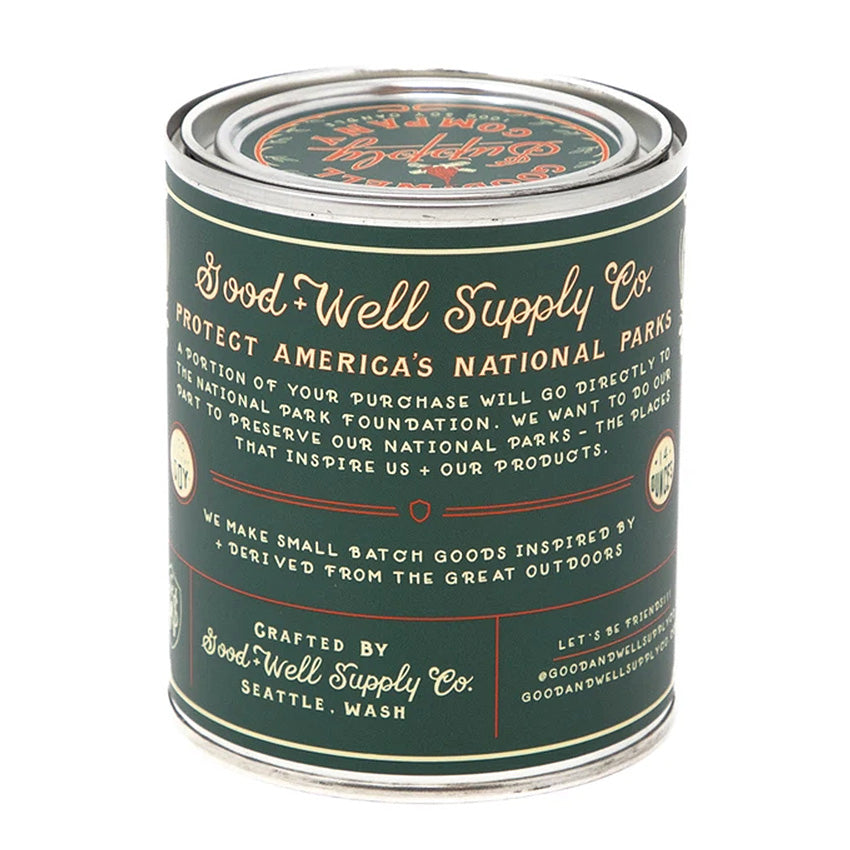 An all natural soy candle handcrafted to impart the scents of the wild and pristine lands of America's National Parks. Good & Well craft products that celebrate nature and advocate for and support public lands through annual donations to the National Park Foundation and Washington National Park Fund.