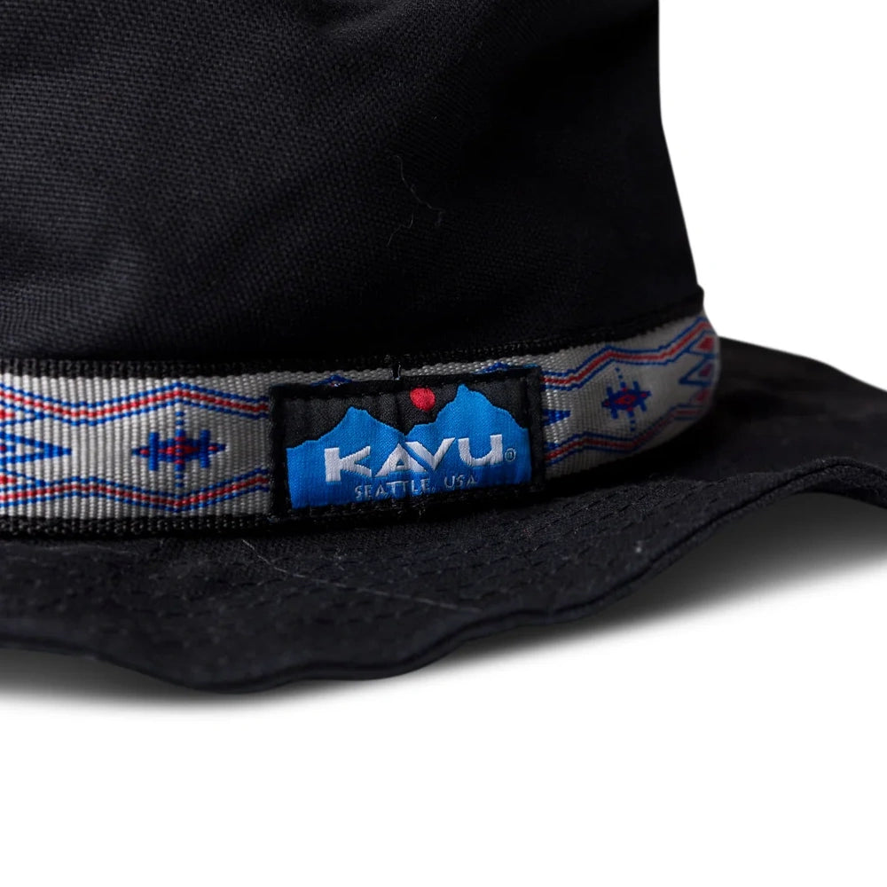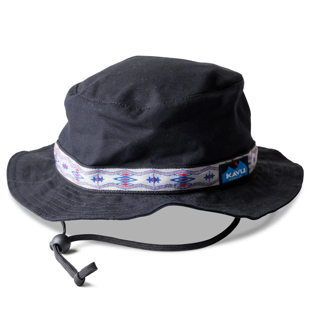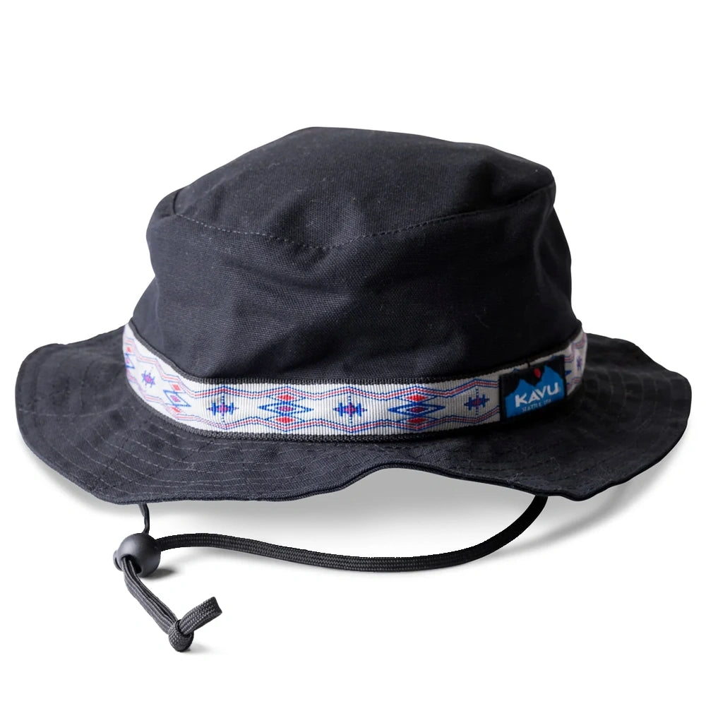 Adjustable chinstrap with cord lock means the hat will stay on even when active. Classic bucket hat floppy brim with patterned nylon tubular webbing in classic KAVU style. Interior moisture absorbing sweatband makes for all day comfort.