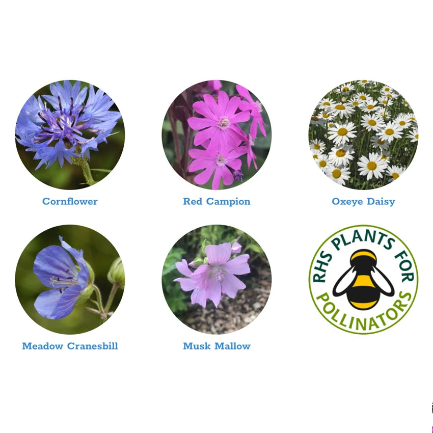 • Includes: Cornflower (Centaurea cyanus), Red Campion (Silene dioica), Oxeye Daisy (Leucanthemum vulgare), Musk Mallow (Malva moschata), Meadow Cranesbill (Geranium pratense)