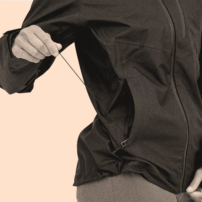 Centre-front zipper and chest pocket with watertight zips and zipper garages and two welted handwarmer pockets that stay clear of pack waistbelt or harness. Under the arms there are pit zips with welted, watertight two-way zippers to provide ventilation when the walking gets tough. Adjustable drawcord cinch at the hem is routed up through front pockets to seal out weather and reduce bulk under pack waistbelt. The Granite Crest even self-stuffs into left-chest pocket for keeping with you for any day use.