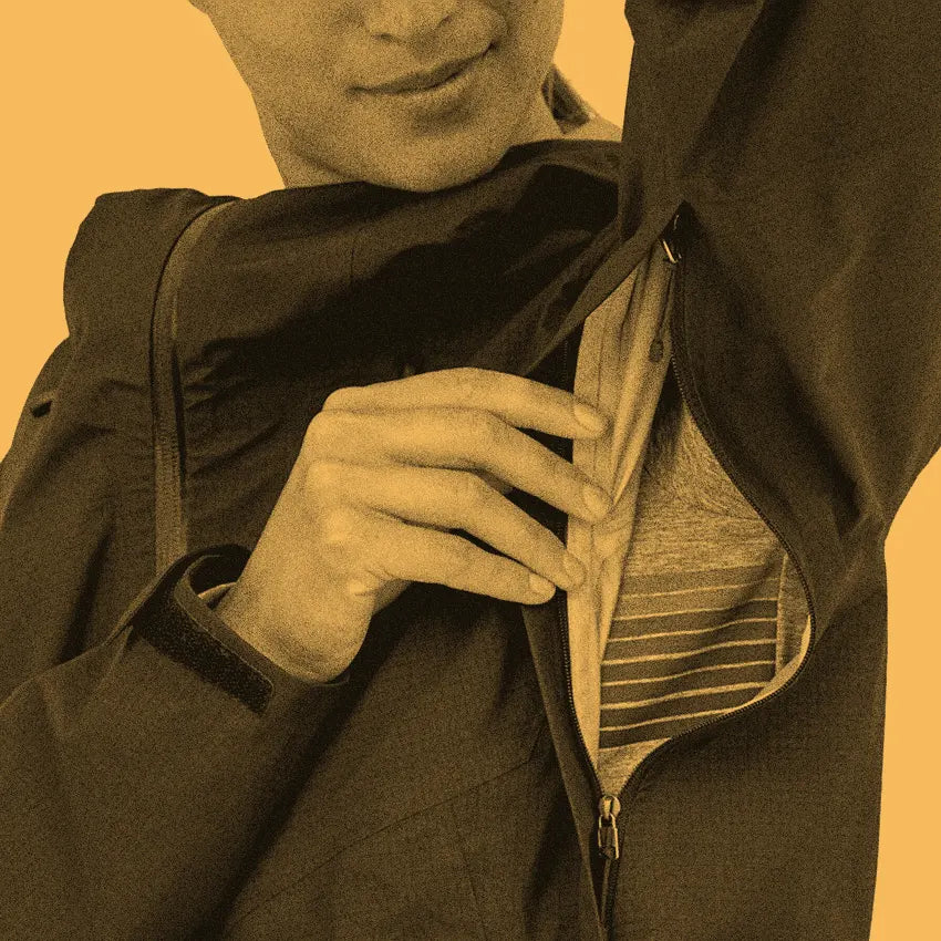 Centre-front zipper and chest pocket with watertight zips and zipper garages and two welted handwarmer pockets that stay clear of pack waistbelt or harness. Under the arms there are pit zips with welted, watertight two-way zippers to provide ventilation when the walking gets tough. Adjustable drawcord cinch at the hem is routed up through front pockets to seal out weather and reduce bulk under pack waistbelt. The Granite Crest even self-stuffs into left-chest pocket for keeping with you for any day use.