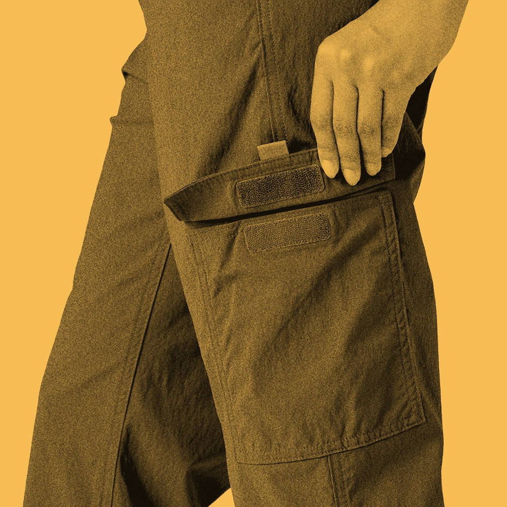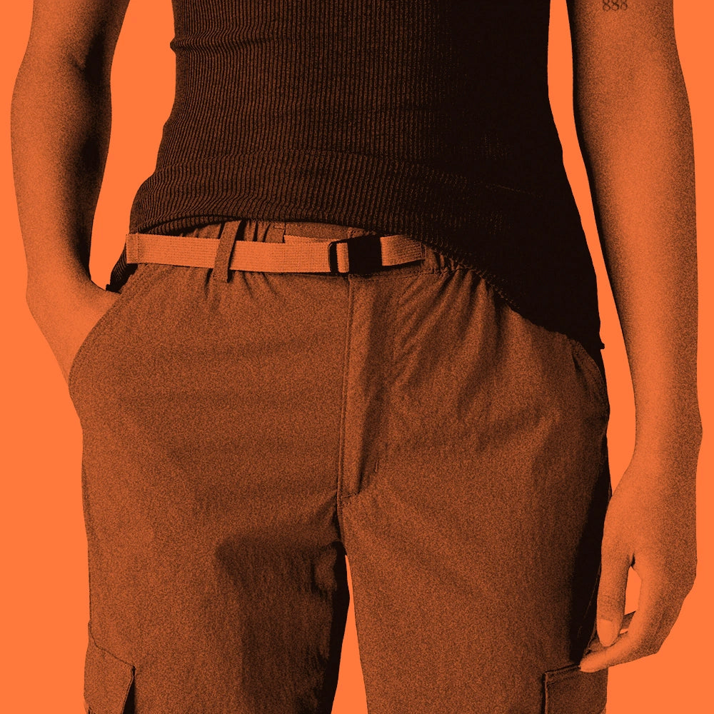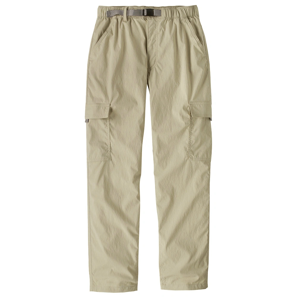 The Outdoor Everyday Cargo Pants fabric is treated with a durable water repellent (DWR) finish made without intentionally added PFAS and offers 40+ UPF sun protection. With an elastic waistband that has a zip fly and a button closure for secure fit. There's also an adjustable webbing belt that can be tucked into the belt loop to keep excess webbing at bay. Featuring two front drop-in pockets and two thigh cargo pockets that have flaps and hook-and-loop closures, with webbing tabs for ease of use.