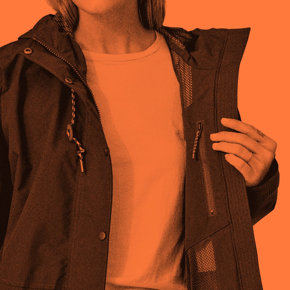 The shell fabric of the Outdoor Everyday Rain Jacket is a NetPlus® 100% postconsumer recycled nylon faille made from recycled fishing nets that helps to reduce ocean plastic pollution and is treated with a durable water repellent (DWR) finish made without intentionally added perfluorinated chemicals (PFCs/PFAS). The jacket lining is 100% recycled polyester tricot mesh with a wicking finish and its made in a Fair Trade Certified™ factory.