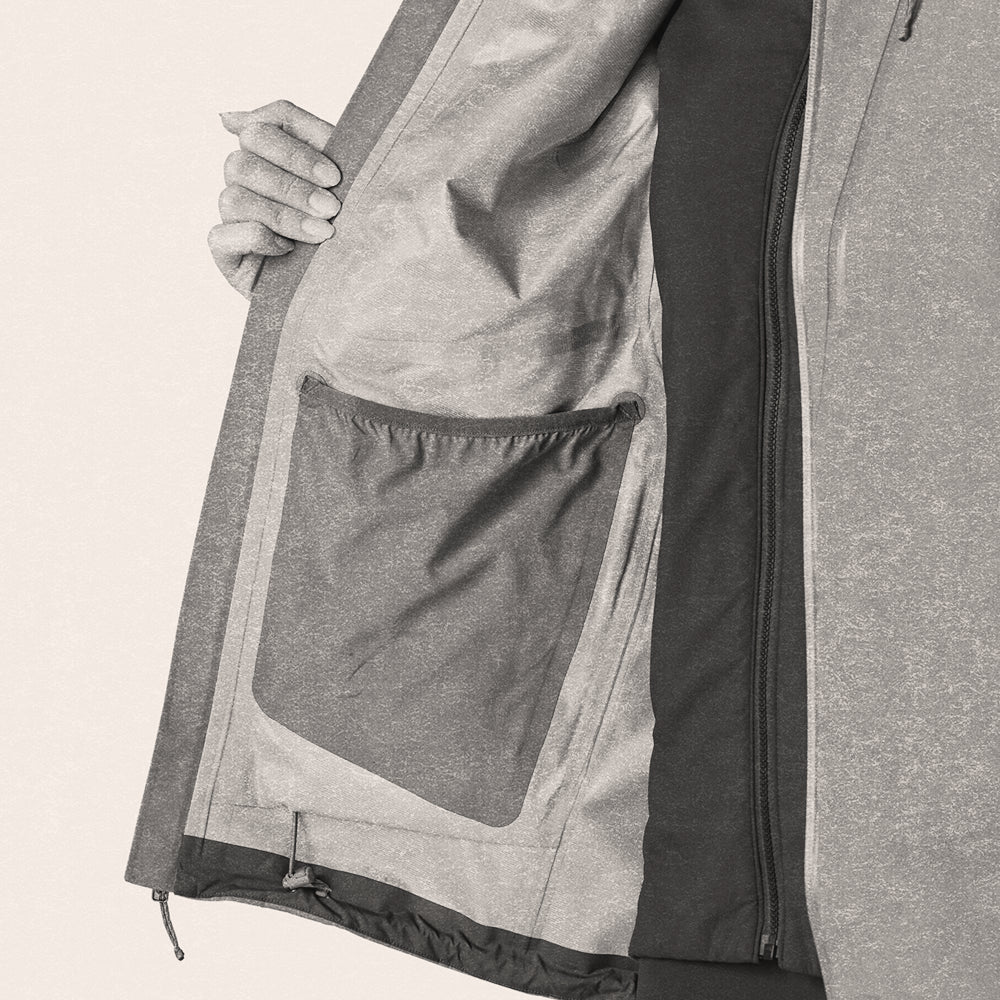 Materials: PFC-free waterproof/breathable shell (fabric, membrane, and finishes do not contain perfluorinated chemicals), 3-layer, 4.5-oz 75-denier 100% recycled polyester PFC-free GORE-TEX fabric with a tricot backer. Fabric, membrane and DWR finish made without intentionally added PFAS