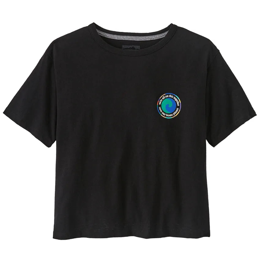 The artwork for Patagonia's Unity Fitz range features a stylised Earth and the message "we're all on this together - save our home planet." Printed on a T-shirt built with 100% recycled fabric that reduces reliance on virgin raw materials. Made in a Fair Trade Certified™ factory.