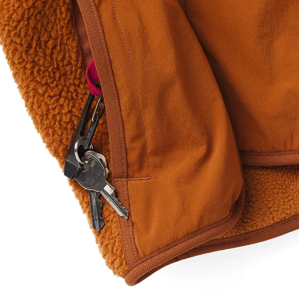 Cordura® blend overlays are strategically placed at the elbows and forearms to provide abrasion and water resistance, protecting against wear and tear and extending the life of the jacket. The cuffs, placket, collar, and hem are twill-bound for added texture and style. Each hand pocket is lined with fleece for extra warmth. Inside the right one, there’s also a loop made from a Danner boot lace for securing your keys so you don’t lose them on the trail. Perfect for wearing on its own with a tee or with a rain jacket thrown over top to keep you cosy when the weather turns.